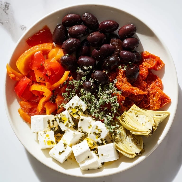 Pin it A vibrant, Mediterranean-inspired finger food platter featuring briny black olives and tangy sun-dried tomatoes, perfect for New Years Eve gatherings.