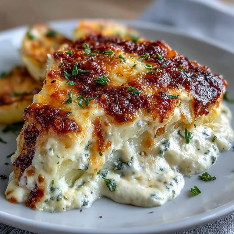 For the most even cooking, slice your potatoes uniformly—a mandoline makes this task effortless and ensures consistent thickness. If you don't have one, use a sharp chef's knife and take your time. The resting period after baking is crucial: it allows the sauce to set slightly, making it easier to serve clean portions. If you're preparing this dish ahead, assemble it completely, cover tightly, and refrigerate for up to 6 hours before baking. Add an extra 10 minutes to the covered baking time if starting from cold.