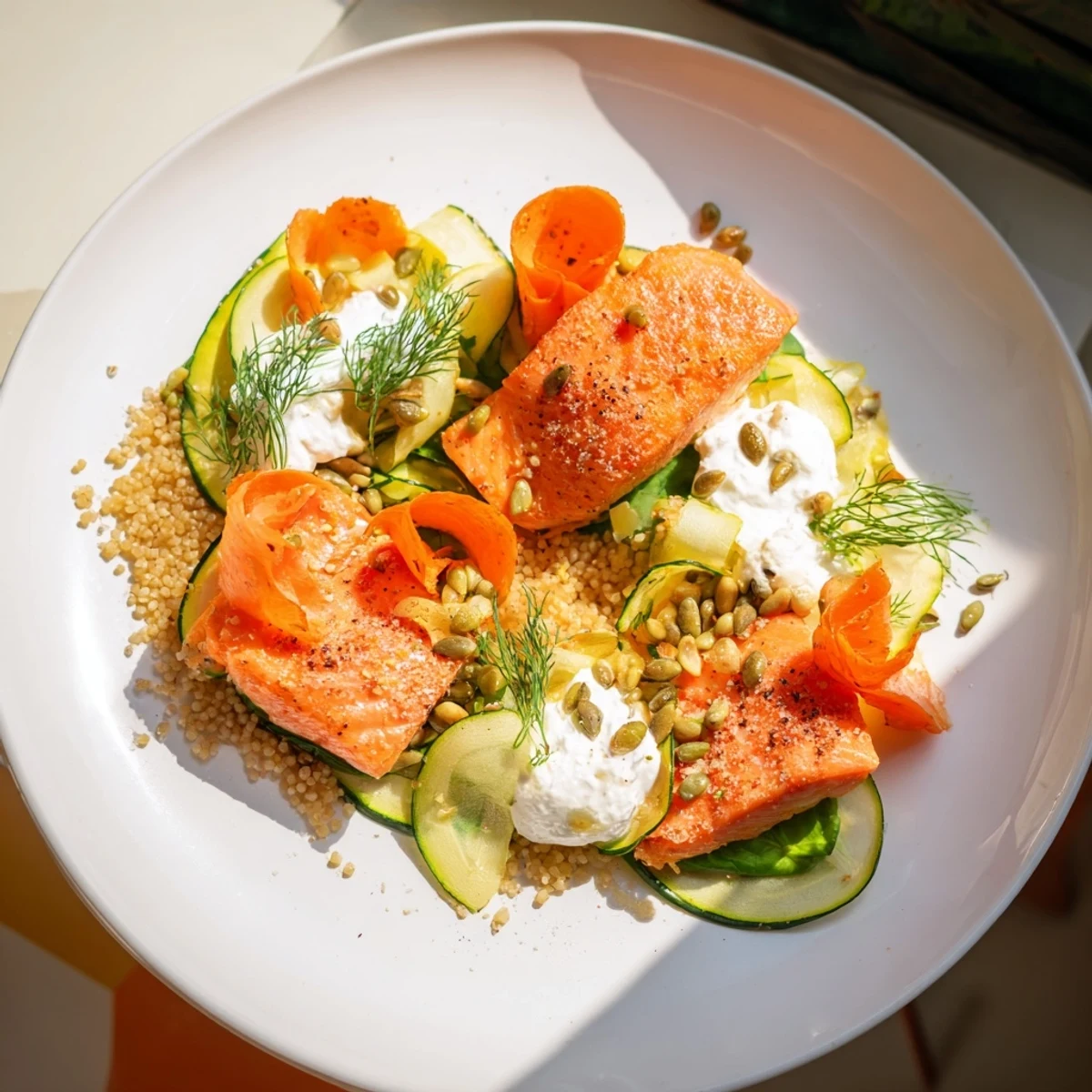 Once you've made this dish once or twice, you'll start seeing it as a template for your own creativity. I've made it with thinly sliced radishes and roasted beets for extra earthiness, and I've substituted trout for salmon on nights when that's what looked beautiful at the market. The couscous can be swapped for farro if you want more texture, or even a very thin risotto if you're feeling ambitious. The point is to keep the philosophy—a lovely grain foundation with vegetables and protein arranged with intention—and make it yours. That's when a recipe becomes a practice, and a practice becomes part of who you are as a cook.