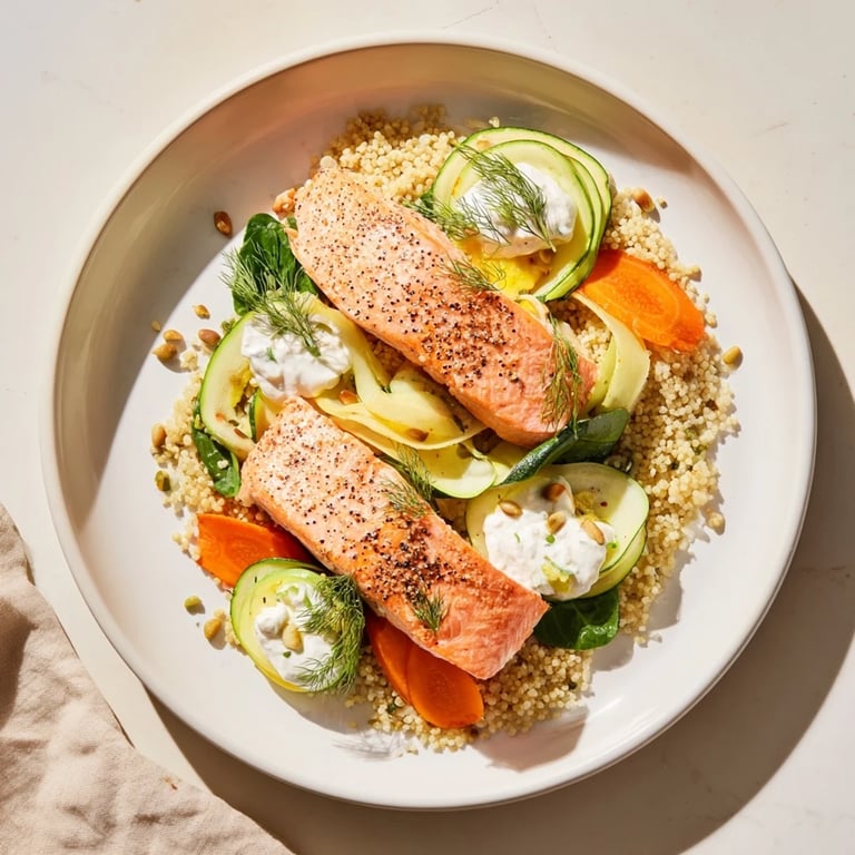 The beauty of this dish is that nearly every component can be prepared in advance, and the final assembly takes only a few minutes. I usually prepare the couscous and vegetables an hour or two before serving, keep them at room temperature, and cook the salmon only 15 minutes before plating. This means you're not stressed in the kitchen right as your guests arrive—you're calm and present. The crisp Sauvignon Blanc or light Pinot Gris mentioned in the original notes truly complements this dish because neither wine overshadows the delicate salmon or the bright vegetables. The acidity in the wine cuts through the richness of the yogurt dressing beautifully.