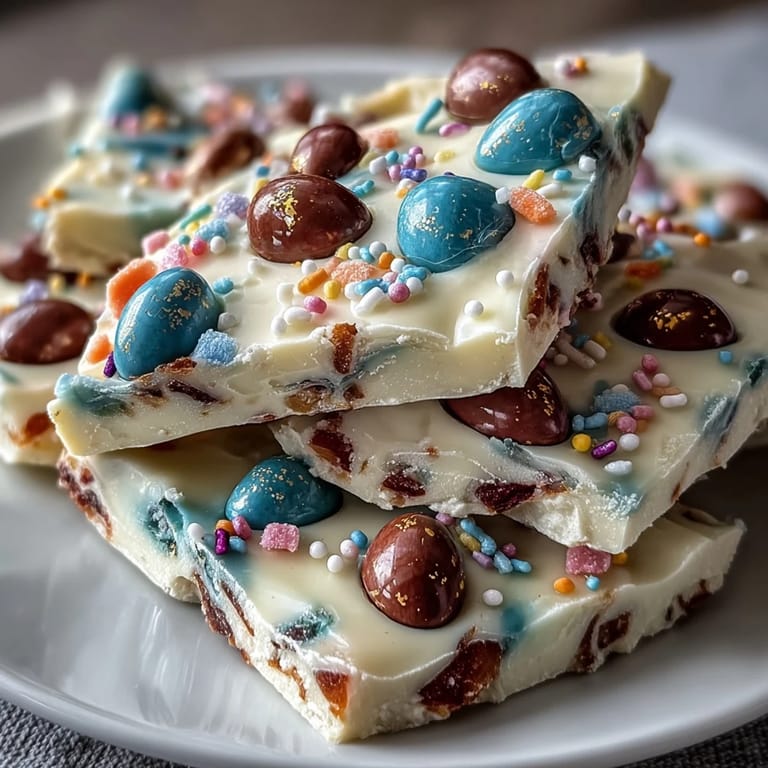 Pin it This recipe is not only festive but also a fun way to bring the family together in the kitchen. Kids will especially enjoy swirling the pastel candy melts and sprinkling the toppings, creating a personalized chocolate masterpiece. The crunchy Cadbury eggs add a delightful texture contrast that makes every bite a celebration.