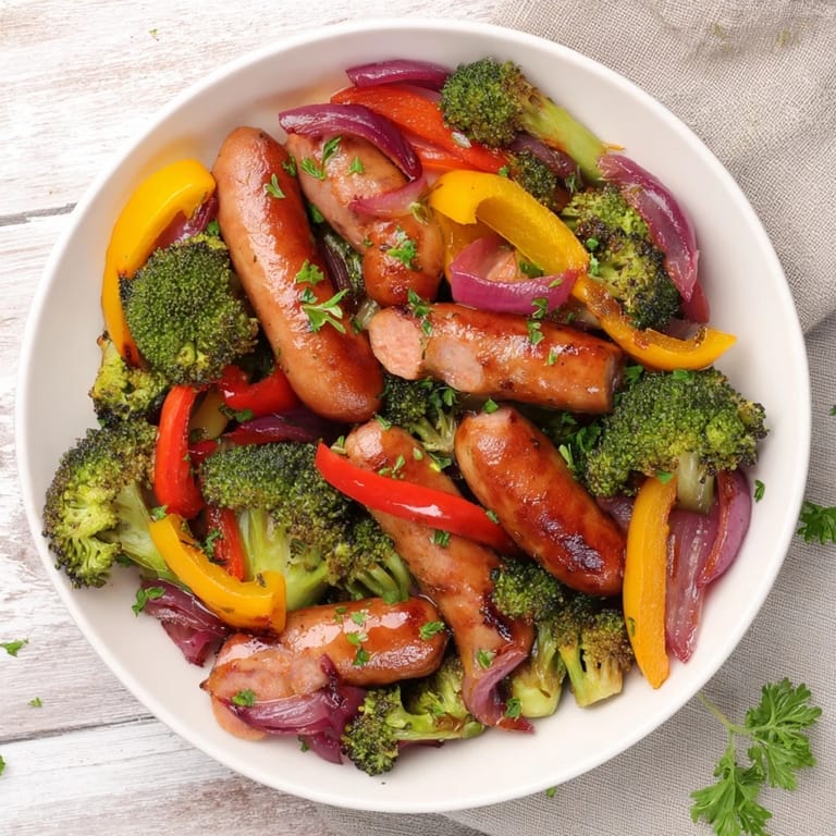 Pin it This simple and wholesome sheet-pan meal is a go-to recipe for busy weeknights when you want something satisfying and easy. With its colorful vegetables and savory sausages, it pleases both kids and adults alike—all while keeping preparation minimal and cleanup effortless.